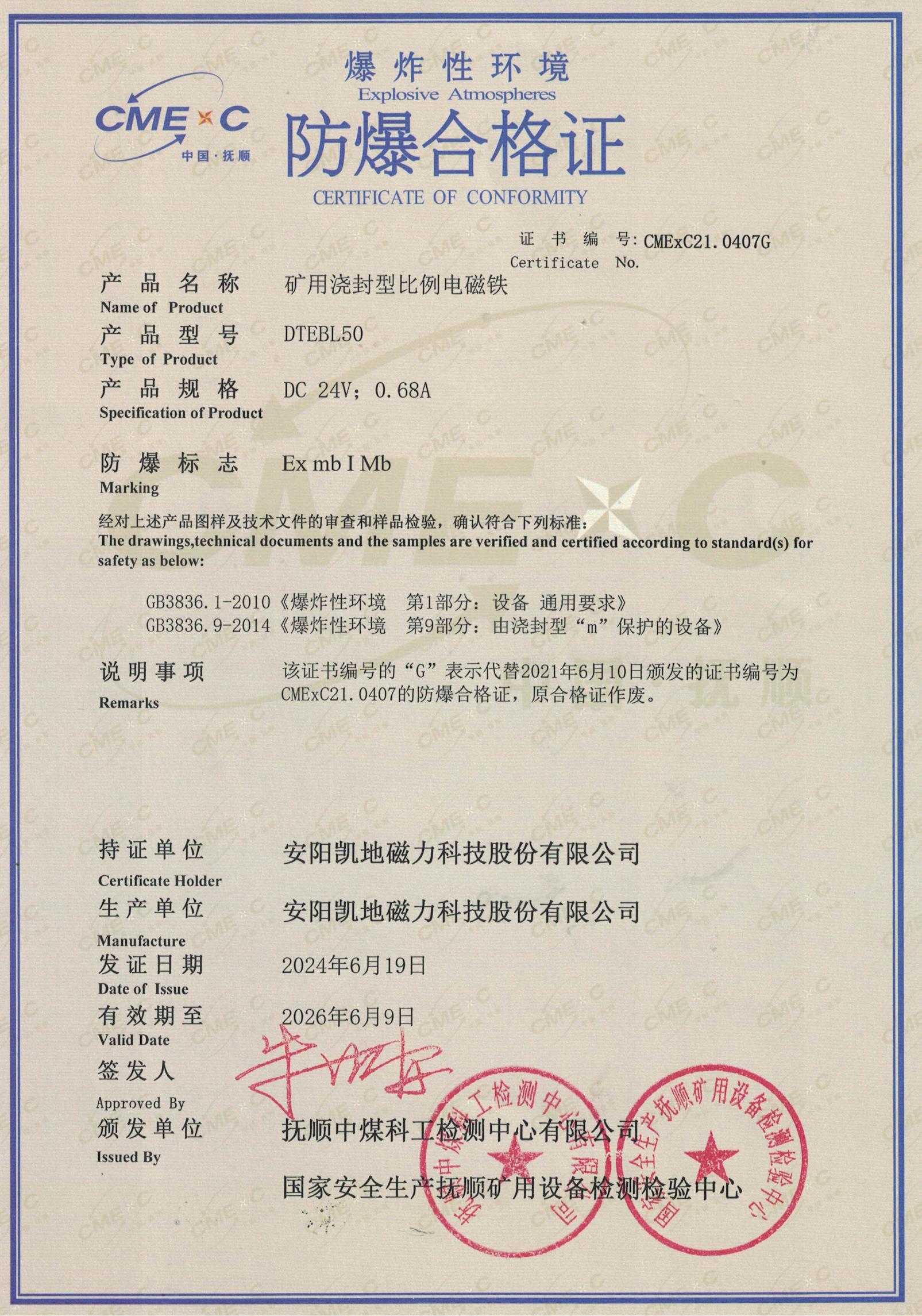 2024312307000487 礦用隔爆型液壓閥用比例電磁鐵 DTBBL10-90FYC CCC證書_00