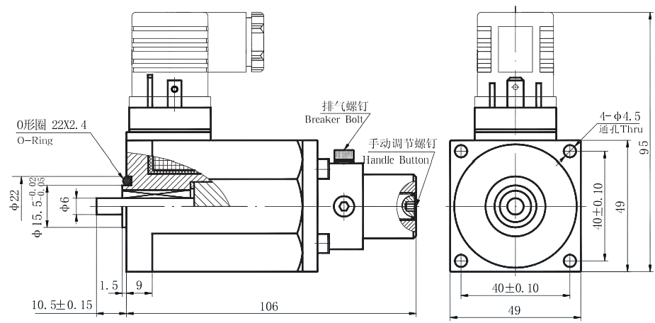 在初期調(diào)整或因電氣故障使電磁鐵沒有輸入電流時,可轉(zhuǎn)動手動調(diào)節(jié)螺釘,臨時設(shè)定閥的壓力或流量。正常使用時請務(wù)必 使手動調(diào)節(jié)螺釘返回原位。