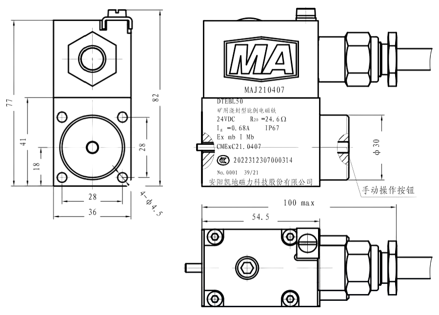本產(chǎn)品為礦用澆封型比例電磁鐵,可在含有煤礦瓦斯氣體I類爆炸性氣體環(huán)境中使用,實現(xiàn)電磁鐵輸出力與電流的線性比例關(guān)系,產(chǎn)品螺釘安裝,防護(hù)等級IP67。